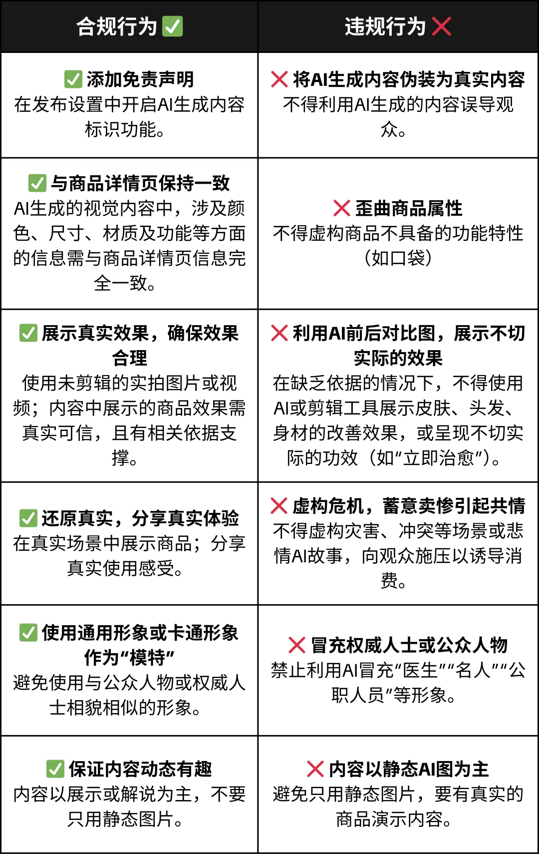 第三个重点,是禁止编造情节营销。通过AI虚构悲情人物、灾难场景或危机故事刺激下单,这种剧情带货模式已被点名。平台强调不得利用同情心理推动冲动消费,对于想走情绪路线的卖家来说,这意味着创作边界被重新界定。