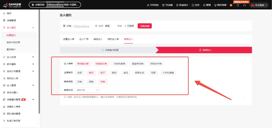 东南亚市场达人资源丰富、竞争激烈,想要高效触达合适的达人并不容易。但有了达秘,商家可根据榜单类型、主营类目精准筛选并联系达人,让建联更有针对性,大幅提升邀约效率。