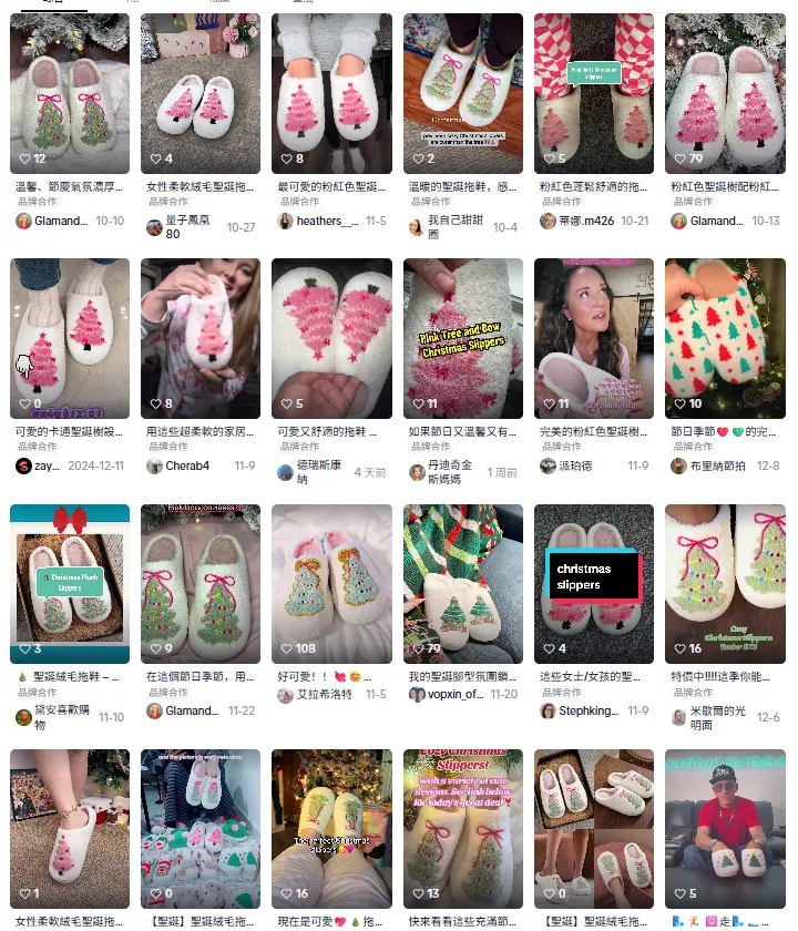 拿TikTok Shop为例子,黑五期间的销售爆款,如粉色圣诞树元素的毛绒拖鞋、超大圣诞蝴蝶结等,均采用了本地化的内容营销模式。