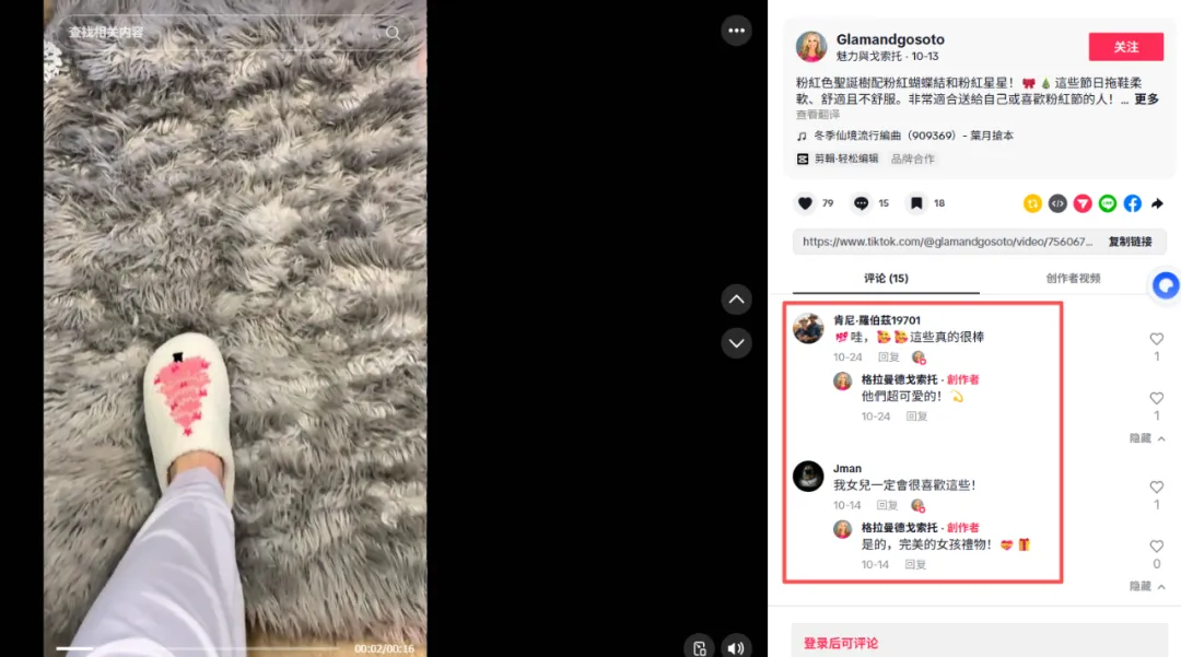 打开评论区,可以看到,用户都被视频中渲染的节日气氛感染,表示想要拥有一双圣诞拖鞋,或者将其作为礼物,送给亲人。更有用户评论说家里的阿姨也有一双。这些用户的积极评论,使得这款拖鞋再次加速出圈,成为今年的爆款产品。