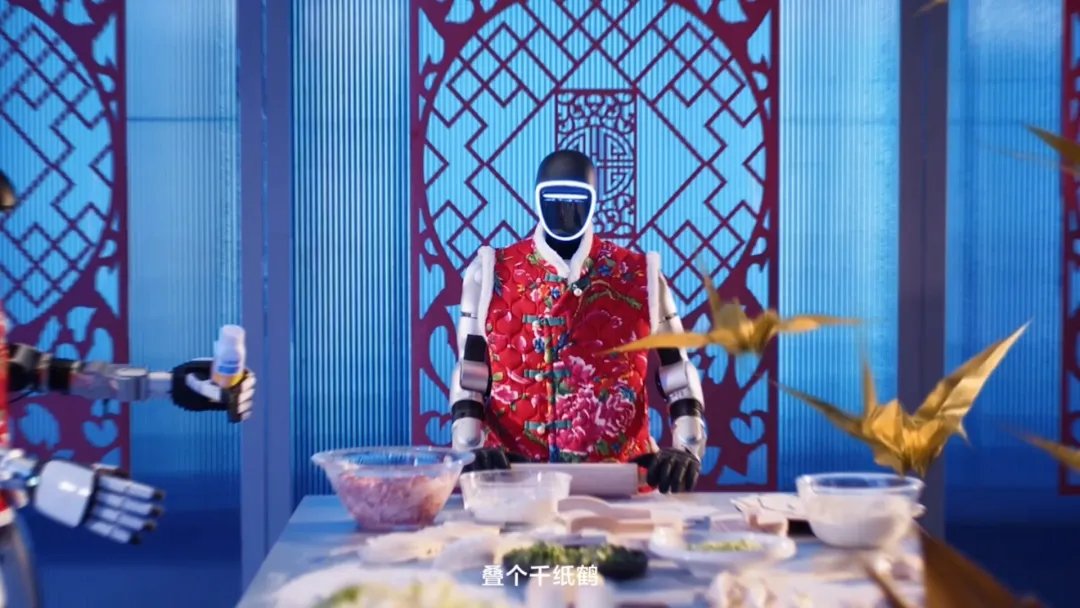 这一次,安慕希不仅组建马年首个机器人男团,唱跳改编开运金曲《好运来》,更把他们直接搬到过节现场——包饺子、发红包的传统年俗搭配金属千纸鹤、光缆中国结,赛博年味拉满了!更洗脑的是,反复出现的「I’m machine」与「安慕希」形成魔性谐音联动,在卡点舞蹈和喜庆音乐中不断强化「爆珠酸奶=爆好运」的记忆点,顺势打爆了「好马年配好喝的安慕希」的产品心智。