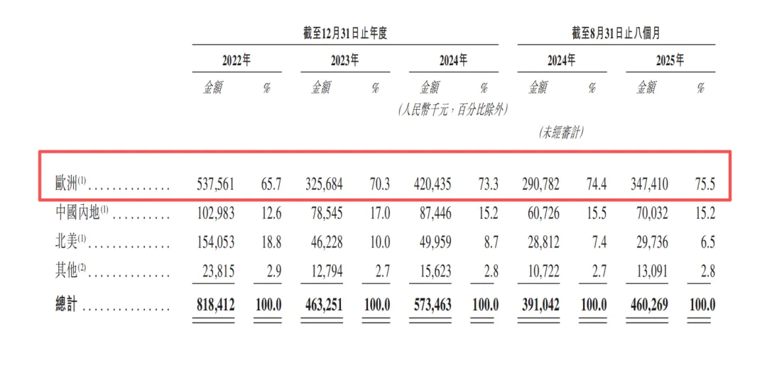 更具体地看,乐欣户外的收入结构高度集中于欧洲。该区域贡献了72.2%的营收,而中国内地市场仅占15.2%。招股书显示,2022年至2025年前8个月,其海外收入占比分别为87.4%、83.0%、84.8%和84.8%,长期维持在高位。