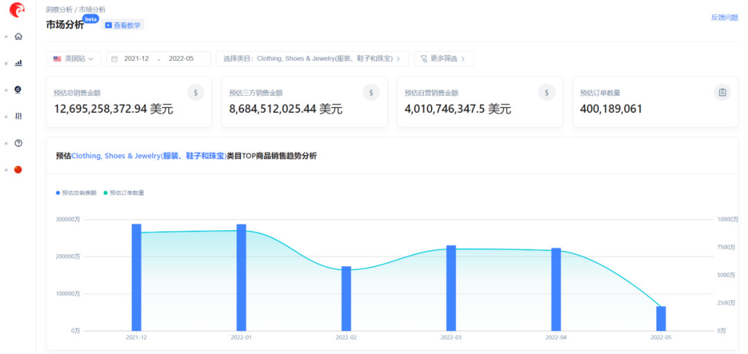 针对这个鸥鹭研发出了"市场分析"功能,填补了市面上对市场容量数据的空白,真实地反映类目市场容量!可以为卖家在很短的几分钟时间内,得到这么详尽的数据,既有TOP销量、销售额,还有亚马逊自营占比、淡旺季情况。让卖家在选品时,更有据可依,为卖家是否进入某类目市场提供决策依据。