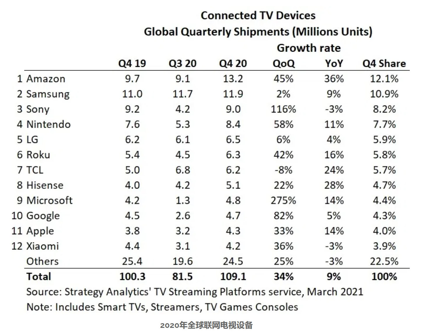 根据全球著名的信息技术,通信行业和消费科技市场研究机构Strategy Analytics对电视机和多媒体播放器的调查研究,AMZ123获悉: 2020年最后一个季度,联网电视设备(包括智能电视,多媒体播放器,游戏机)的全球销量达到3.053亿台,年增长率为7.6%,销售额达到新高。
