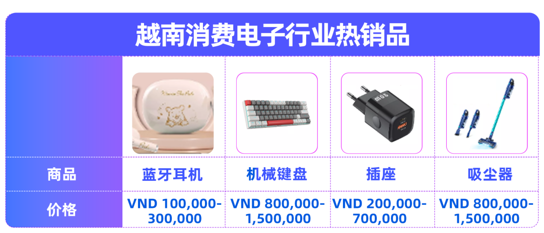 配件市场,手机配件在IP印花款无线蓝牙耳机的带动下,领跑消费消费电子行业消费。电脑配件则更多是外置设备如键盘鼠标、游戏配件的热销,其中机械键盘成为近期越南消费者最爱买的电脑外设之一。年末的年终奖大宗消费人们还会选购可以改变生活品质的家电,一些可平替大牌的家电如吸尘器等近期热度持续升高。