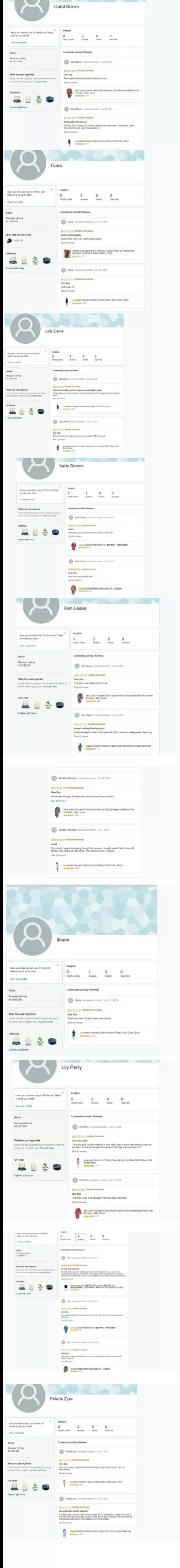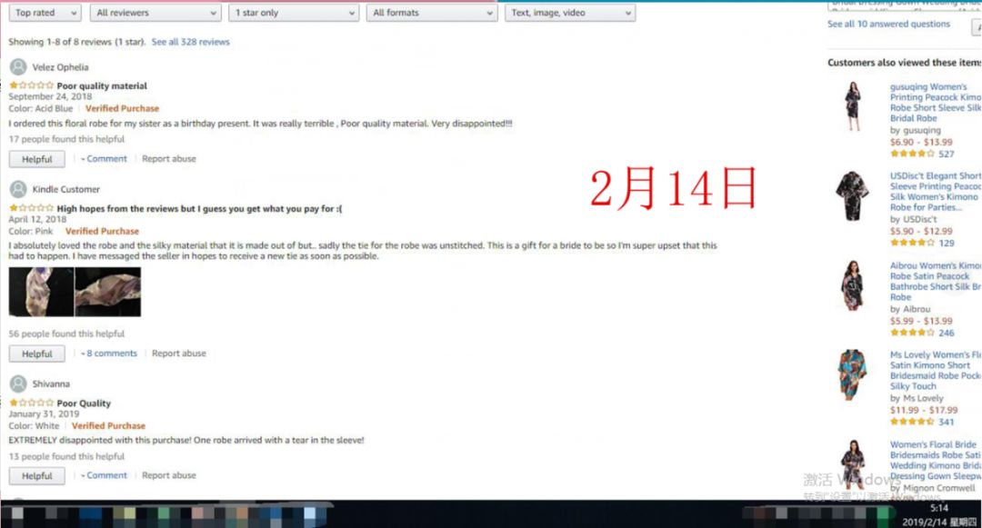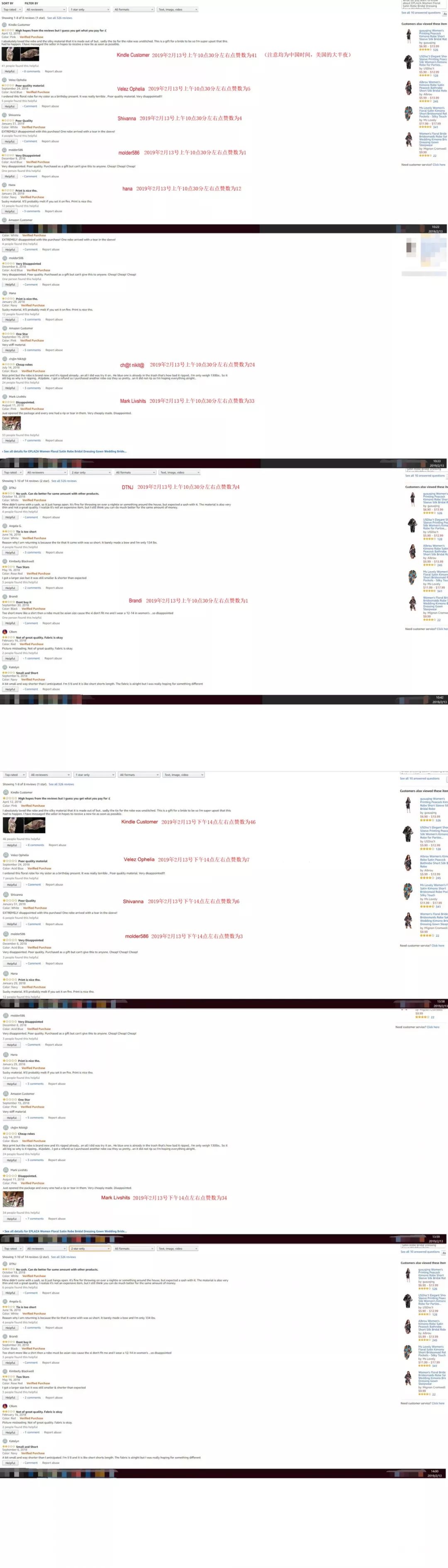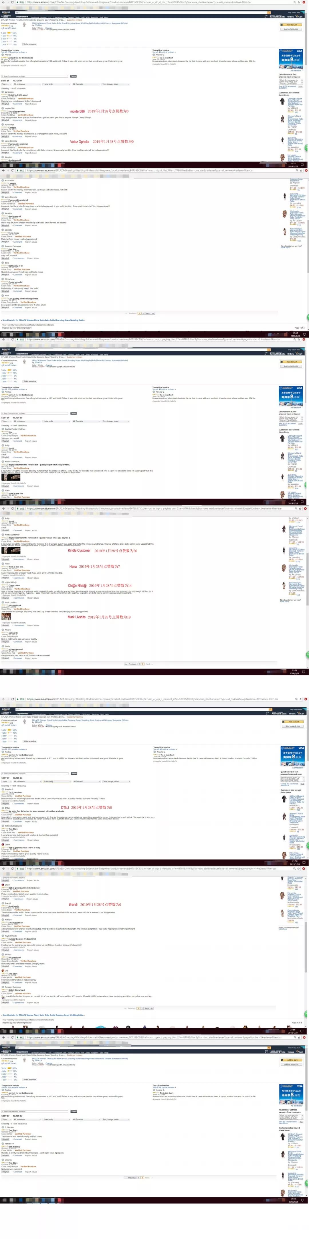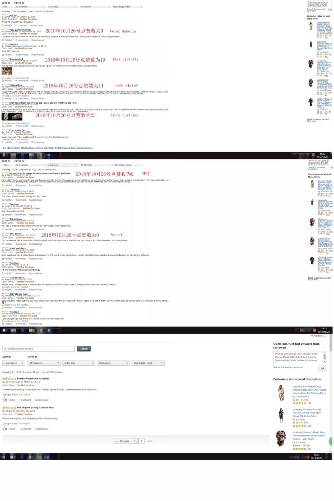 首先是从18年六月份开始,小A发现自己的一款伴娘色丁布睡袍遭到恶意一星差评攻击。通过查看留差评的买家账户后发现:有好几家和她们一样的受害卖家。这里可以看看当时一小部分截图:同一个买手账户公然给几家产品上差评。
