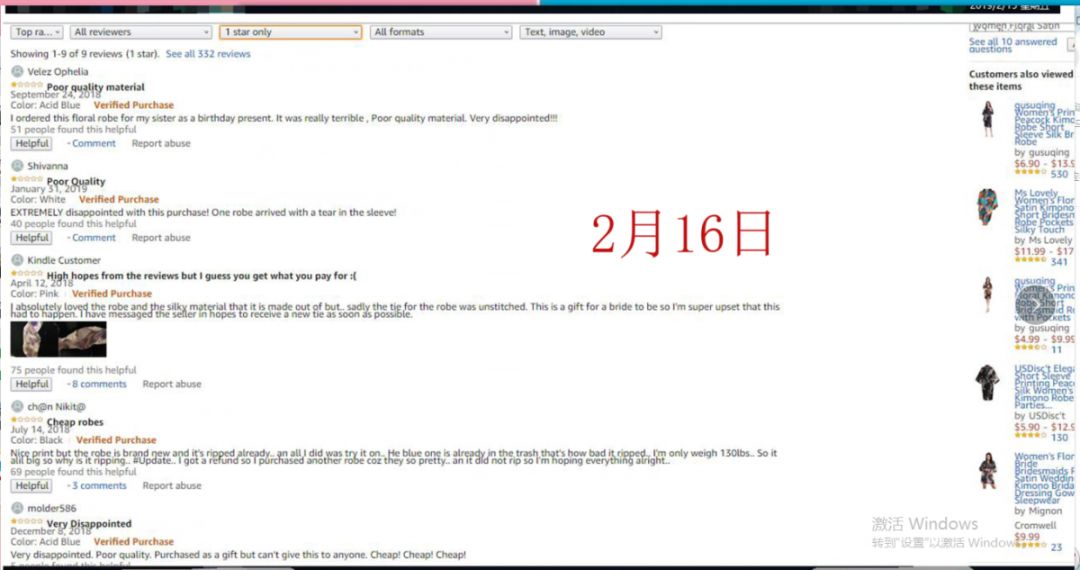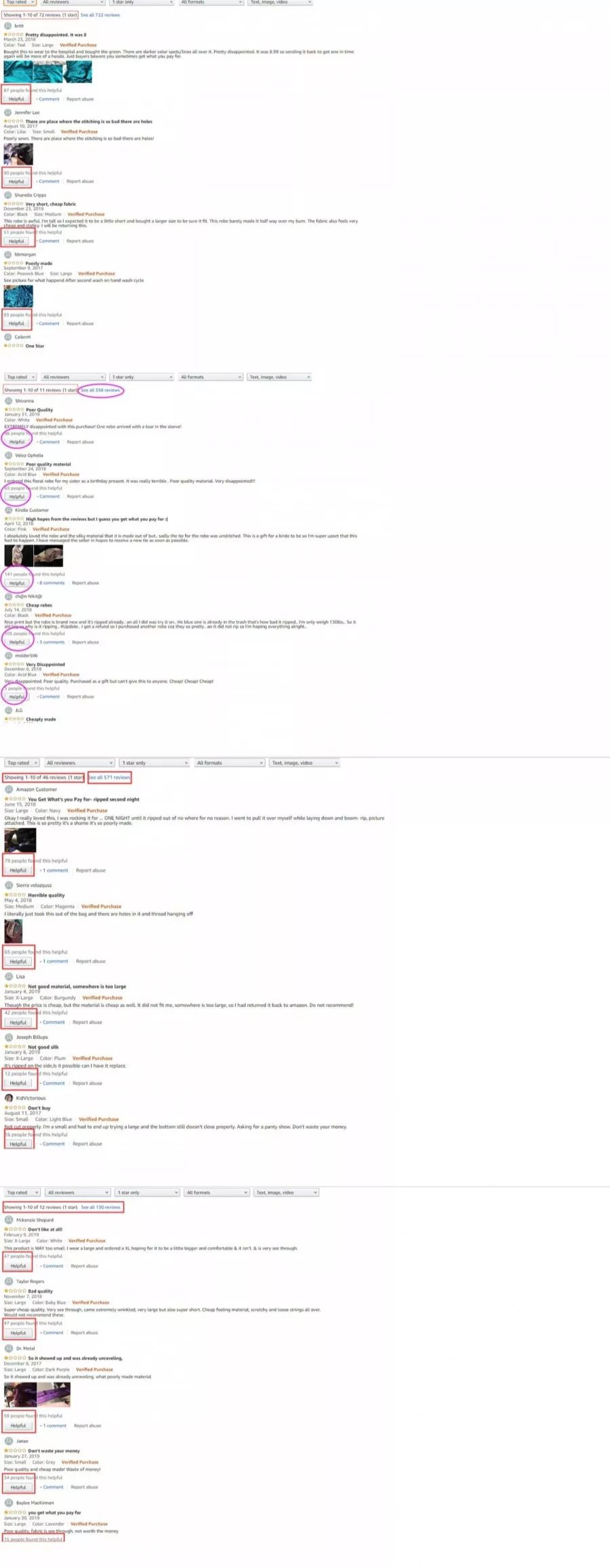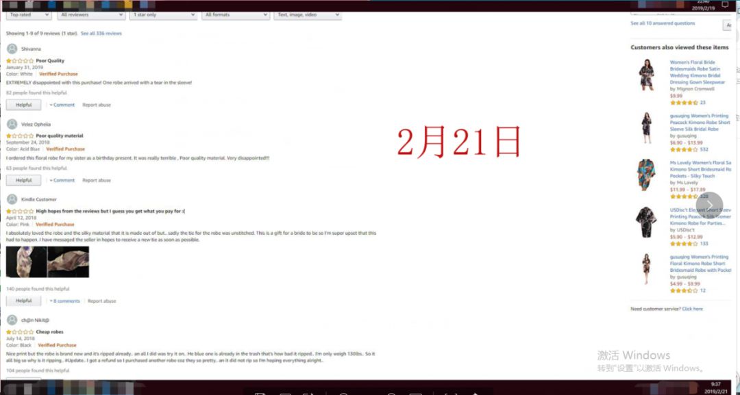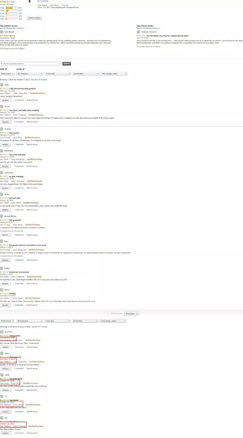 为了更直观的表达,请看这几家受害卖家的一星评论截图:最近的一星评论都是集中在18年12月底和19年1月,相似评论内容,无非就是便宜,烂,开线,破了,掉色,尺码不对,小,短,没有腰带等等。