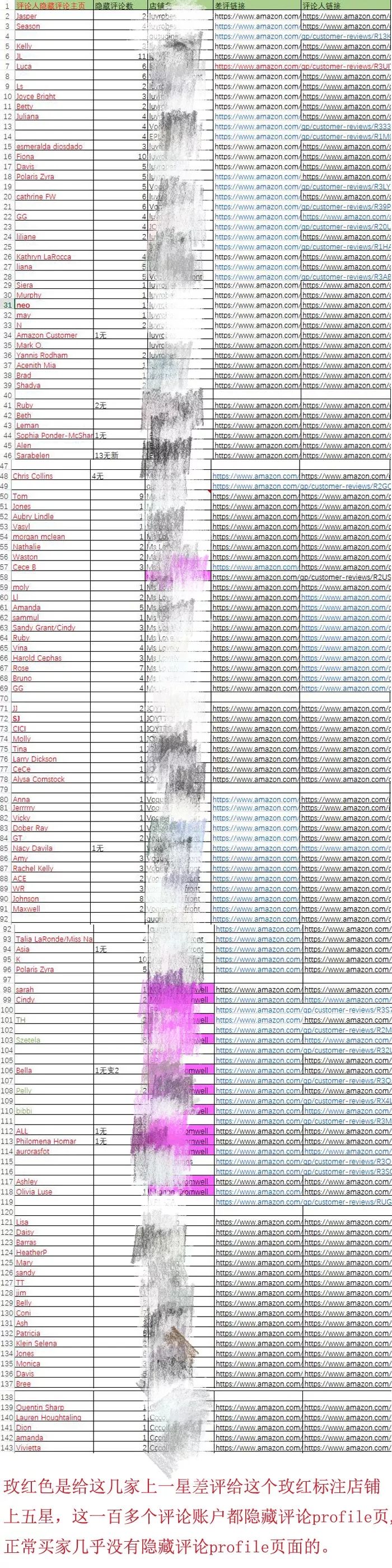 而且到后面,19年年初的时候,通过整理小A家和其他受害卖家的一星差评,发现了一百多个隐藏评论profile页面的买手账号。这位大卖这么做,就为的是增加受害卖家申诉难度,还有就是不想暴露他们自己。更可恶的是他们比较明目张胆地用这些留差评的账户给自己家新店铺上好评了。这个表格是100多个差评评论链接和这些评论账户profile页面链接。玫红色标注的是他们给自己留好评的店铺(这里为了不暴露品牌,我还是隐去了,希望能够迷途知返,不要一错再错)
