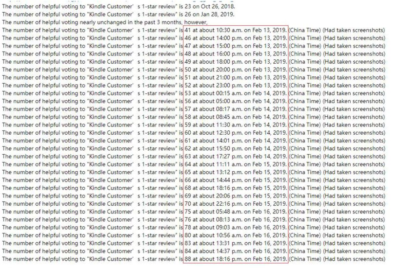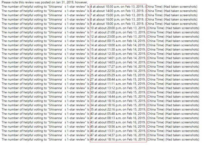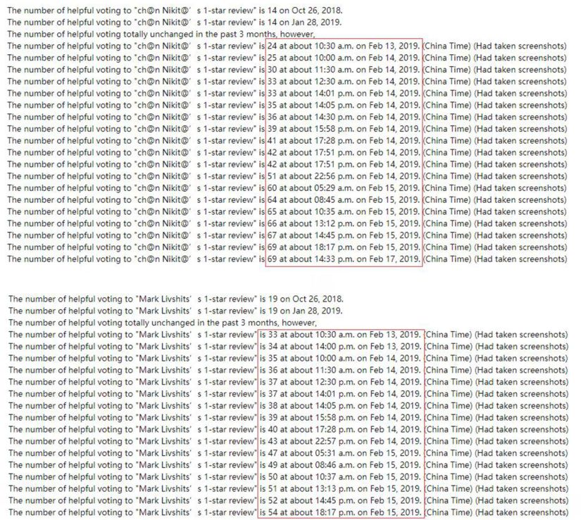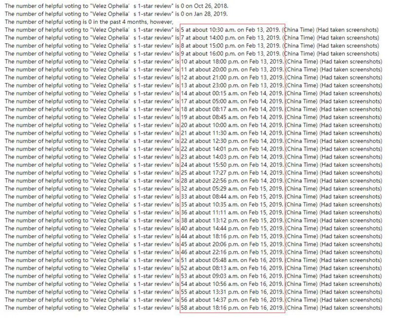 一波差评以后,一波恶意点赞又来了,而且还是针对这个类目几乎所有卖的好的卖家。小A从2月13号就发现:他们的一星差评又开始点赞数量急剧上升。过去三个月点赞数量不变,却在2月13号开始每小时都在点击helpful。小A他们截图留取了每个时间段的点赞数量截图。