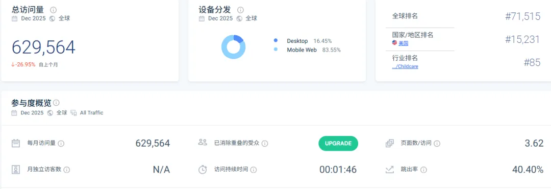 此外,Kyte Baby通过“睡眠知识”栏目,持续解答新手父母最关心的睡眠与穿着问题,并以此承接搜索流量,建立专业信任。同时,品牌以 Kyte Cares 公益项目长期连接 NICU(新生儿重症监护室)群体,将信任从产品体验延伸到情感认同。这种长期信任的积累,也直接反映在用户行为上:官网月访问量约 629,564,其中近五成为直接访问。