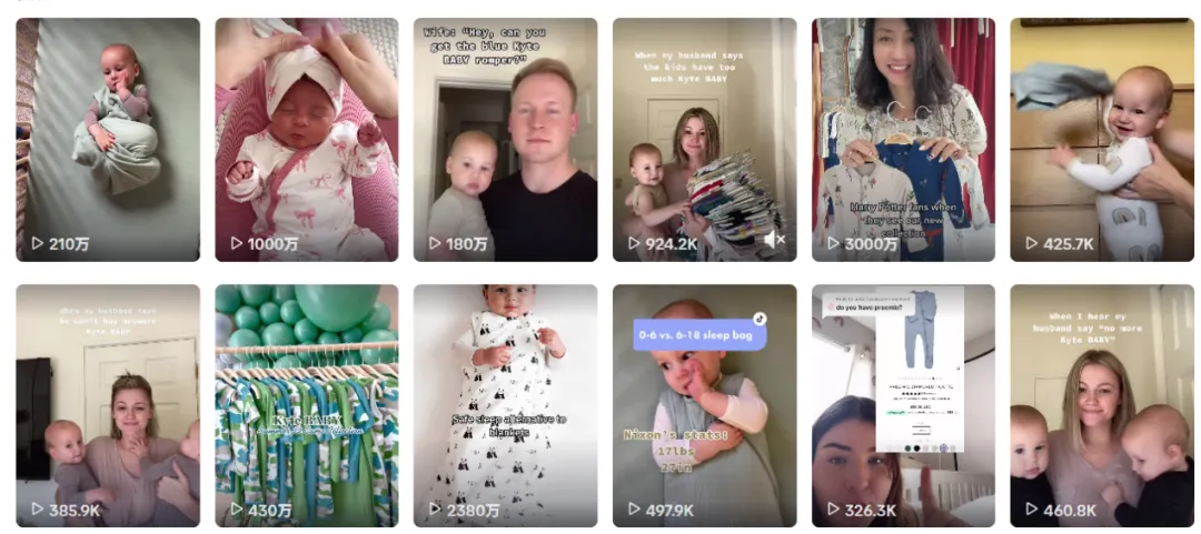 视频围绕“试穿展示 + 细节讲解”展开,通过真实穿着状态,直接呈现面料触感、活动空间和尺码适配情况。产品优势被自然放进孩子的日常活动与成长变化中,帮助家长快速理解使用周期与实际场景,也让 Kyte Baby 被视为可以长期陪伴孩子成长的选择。该视频播放量接近1000万,点赞数超过200万。