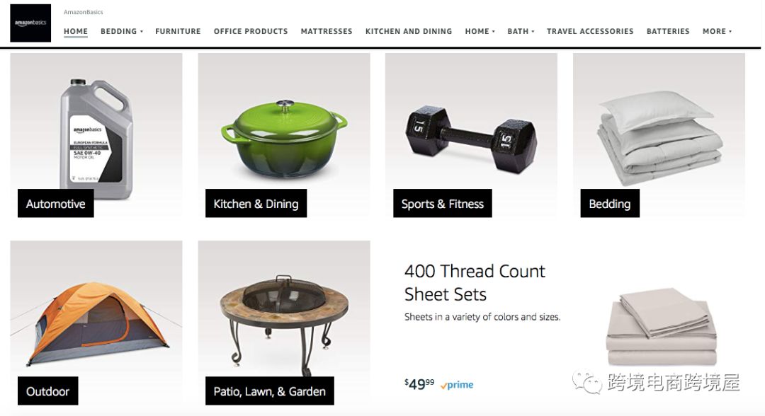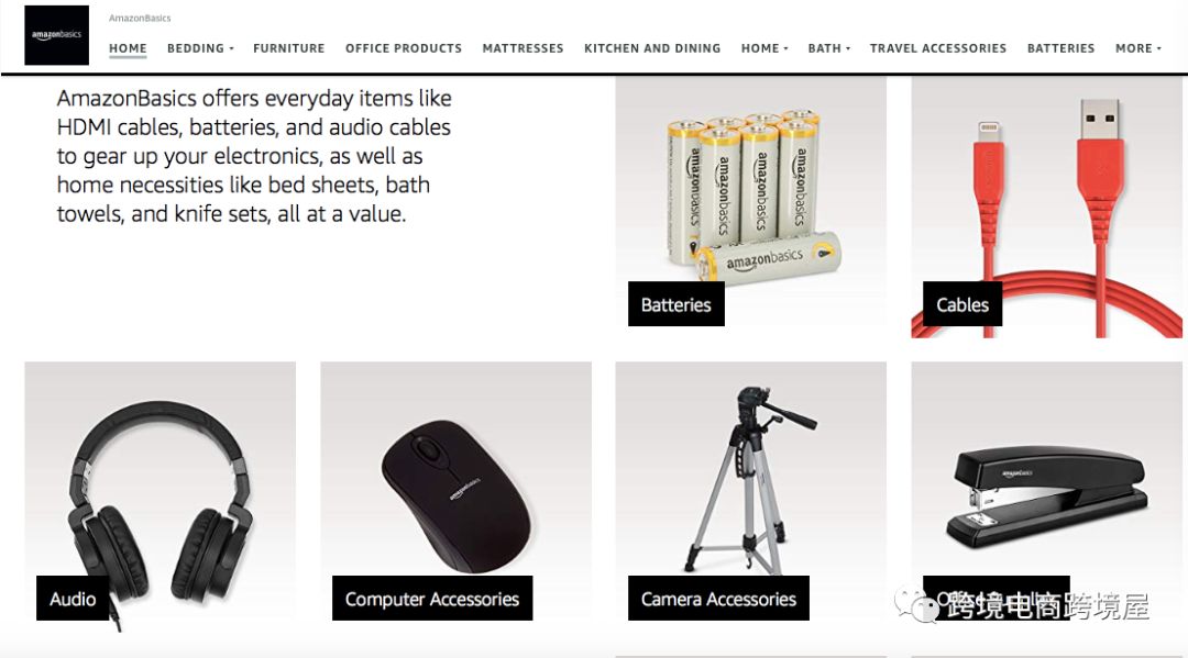 AmazonBasics在2009年发布,直译为“亚马逊基本”,初期产品主要有充电线、插座、电池等电子易耗产品小型家居用品等,后来扩展到厨房用品,床上用品,电脑配件,手机配件,办公用品,运动户外用品等等。品牌价值调性和亚马逊的竞争对手沃尔玛推出的自营品牌“Great Value”一样,主打低价、优质。大多数品类的亚马逊第三方卖家,都会遇到AmazonBasics这个竞争对手。