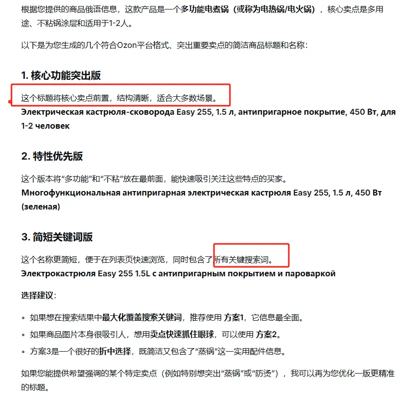 然后呢,它会根据主要卖点生成几种方案。我们可以选一个作为标题使用,接着我们再让它生成一段商品描述。
