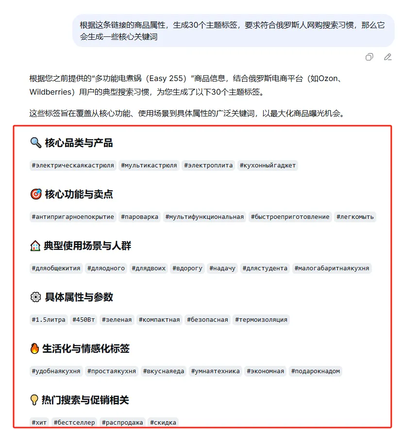如果主题标签不会写,那我们接着给他输入指令根据这条链接的商品属性,生成30个主题标签,要求符合俄罗斯人网购搜索习惯,那么它会生成一些核心关键词。