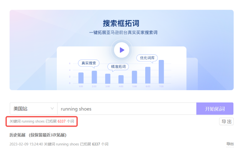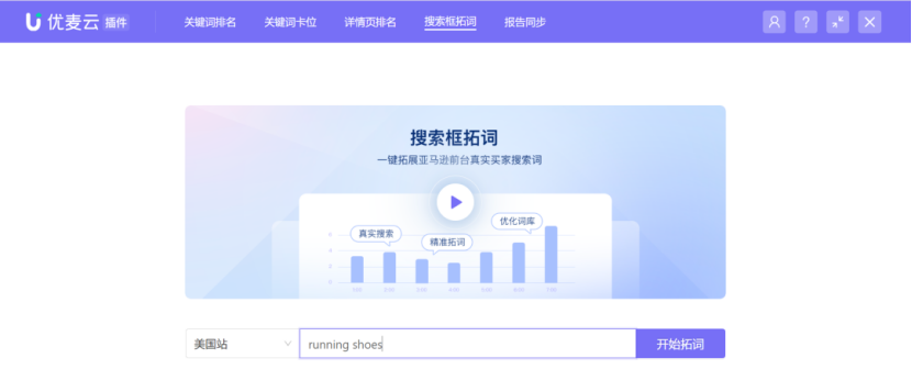 打开优麦云插件,选择【搜索框拓词】功能,输入要收集的核心关键词(2个单词数及以上),点击【开始拓词】即可。