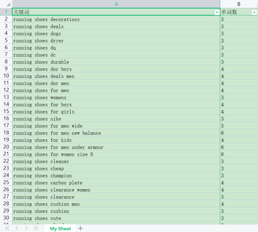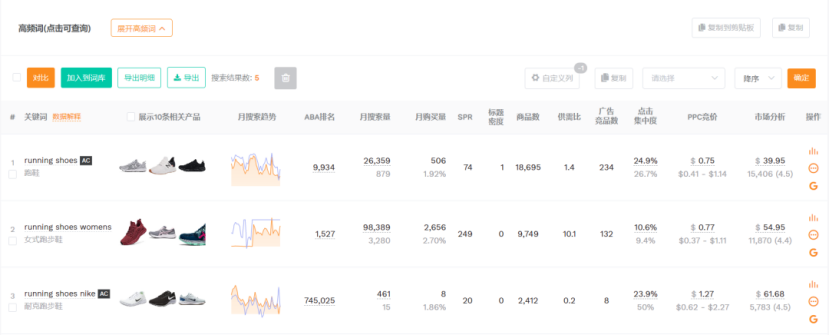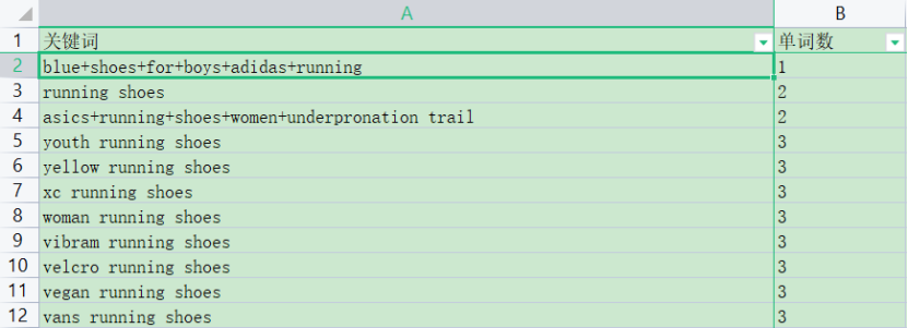 例如,将要投放广告词:running shoes,进行广泛匹配投放。在搜索框拓词中进行拓展,找出该词可能匹配到的所有相关搜索词,导出结果。