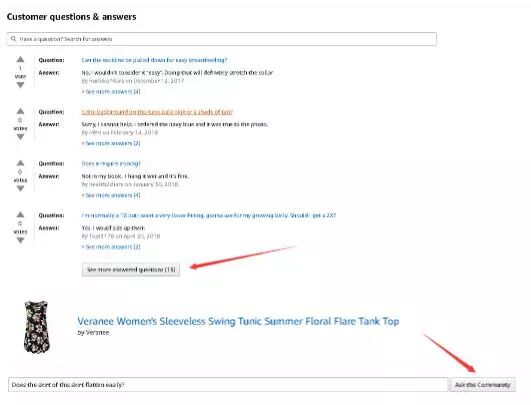 (4)买家可以点击Ask The Community去提问,在已经登陆亚马逊前台账号的前提下直接输入英文问题就OK了,具体操作如下:点开“See more answered questions(XX)”直到看到“See all questions(XX)”,点击进入。