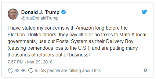 虽然白宫发言人否认了特朗普计划采取或即将采取的行动,但特朗普3月29日晚上7点多又发布了一条Twitter称:“早在大选前,我就已经表明了我对亚马逊的担忧。它向州政府和地方政府缴纳的税收很少甚至不缴税,将USPS作为它的快递员(给美国经济造成了巨大损失),还导致数千家零售商关门歇业!”