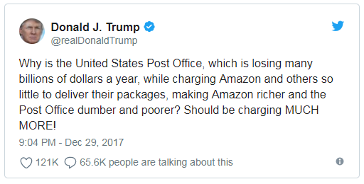特朗普似乎从大选时就看姐夫不顺眼,他曾发推文抱怨USPS对亚马逊收取的运费太低: