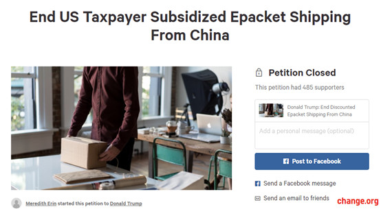 去年,Erin在Change.org网站上发起了一项请愿,要求特朗普政府停止补贴ePacket运费,以保护美国的经济和消费者。但是要得到白宫的回应,请愿签名还是太少了。对此特朗普不予置评。