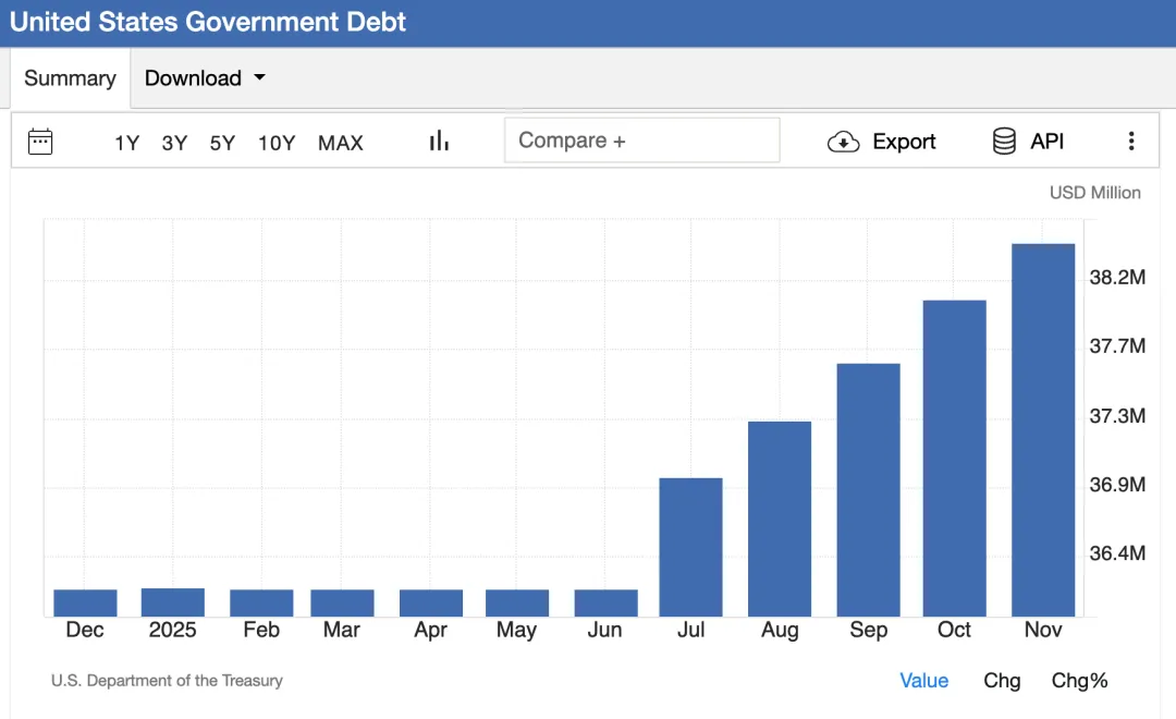 债务问题仍是美国政策空间的核心制约。截至2025年底,美国联邦政府债务规模突破38万亿美元,利息支出突破1万亿美元,美国人均债务达11.2万美元,每个家庭承担的隐性公共债务约28.3万美元。
