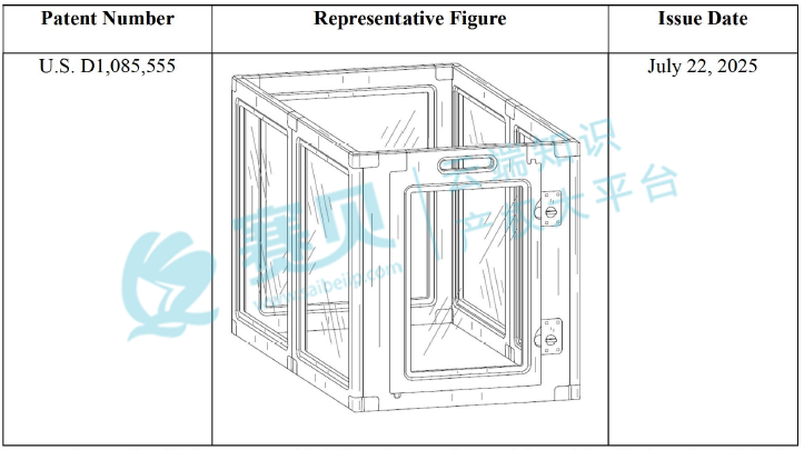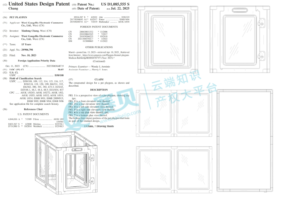此次维权聚焦1项美国设计专利“PET PLAYPEN(宠物围栏)”,专利号US D1,085,555 S,2023年11月10日申请,2025年7月22日获授权。