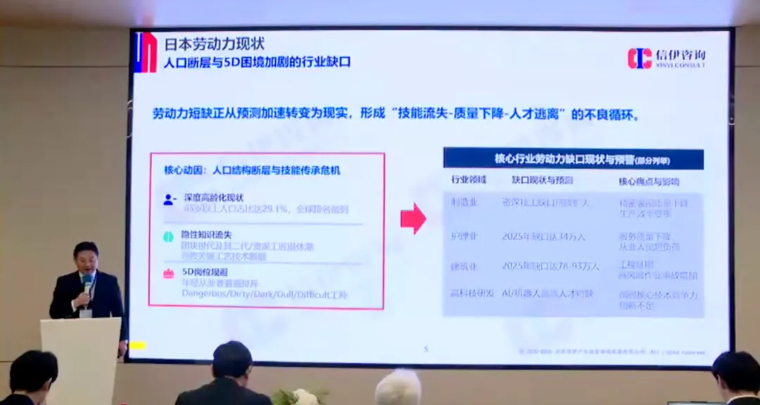 对于日本当下的劳动力现状,信伊咨询(北京)总经理、伊藤忠集团东亚区总代表辅佐(付)海老名裕对此表示:“劳动力供给不足,加上资深工匠逐步退休、核心工艺面临断层,且年轻人不愿从事高危脏乱岗位,导致多个核心行业出现用工荒。”