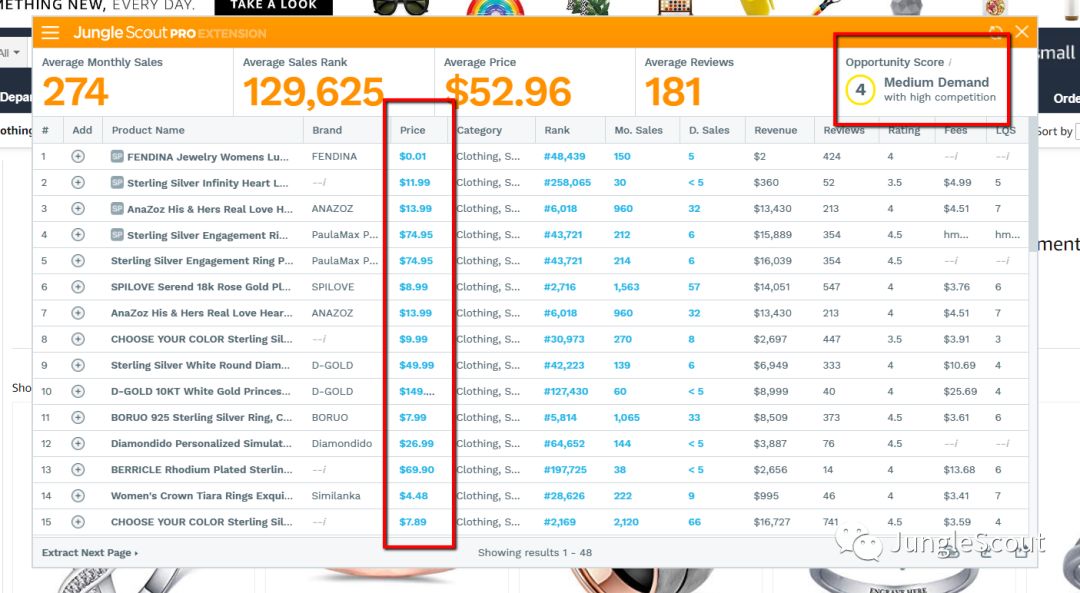 比如:如何知道一个关键词(可以是某种手袋)的销量、价格、竞争程度如何,只要点一下Jungle Scout的专业版插件,马上一目了然。这对于已经物色好要销售哪款产品的卖家来说,可以关注竞品和该市场的状况,对于还没有选定好产品销售的卖家来说,也可以做选品的调研,非常高效、实用。