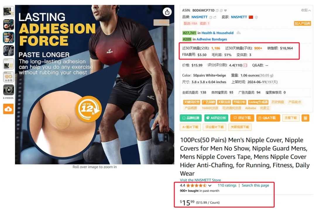 上架197天,售价15.99美金,近30天销量(父体): 1,186,销售额: $18,964。