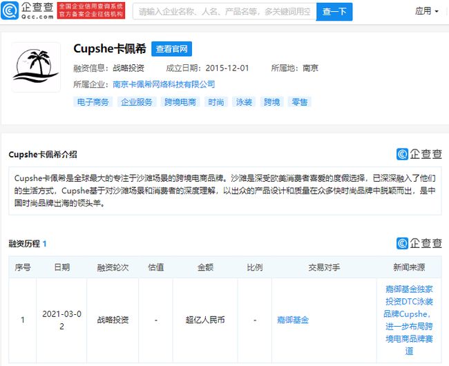 3月2日消息,跨境电商品牌Cupshe卡佩希完成战略投资,交易对手为嘉御基金,金额超亿人民币。企查查信息显示,Cupshe卡佩希隶属于南京卡佩希网络科技有限公司,该公司成立于2015年,法定代表人为胡希英,注册资本3000万元人民币,经营范围包含:自营和代理各类商品及技术的进出口业务等。