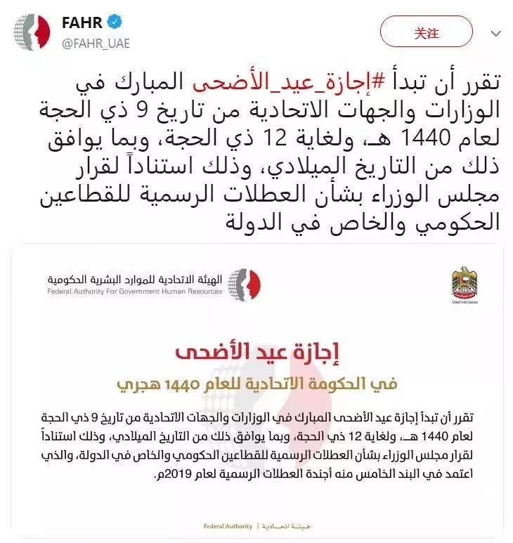 阿联酋联邦政府人力资源管理局在官方推特上公布了今年阿拉法特节和宰牲节的时间,阿拉法特日将于伊斯兰历12月9日即公历8月10日举行,接下来的三天则是宰牲节。