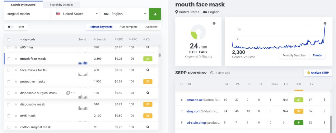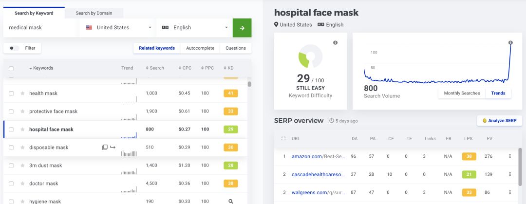 我查了下类似n95口罩等热门关键词,搜索结果页面看到首页基本都是amazon和政府部门的网站,这种词想要短时间内排名做起来的,基本没戏。