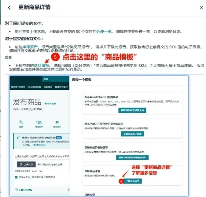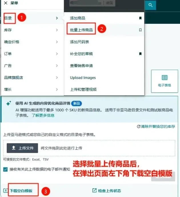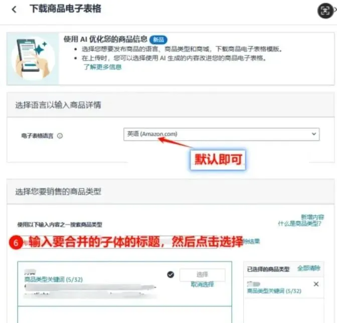 进入卖家后台,点击【菜单】→【目录】→【批量上传商品】 选择【下载空白模板】 在“更新商品详情”区域点击“了解更多信息” 选择【下载空白的商品模板】 内容类型默认选择,输入要合并的子体ASIN或标题,按系统引导完成下载