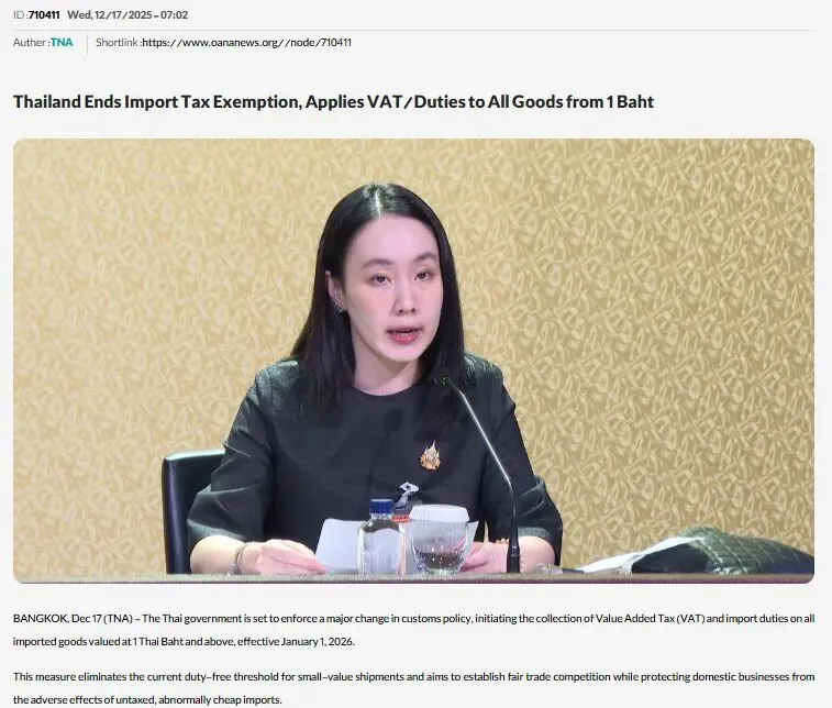 根据泰国海关总署发布的正式公告,本次政策调整的核心在于税收制度的根本性变革。新规落地前,进口货物的CIF价值若不超过1500泰铢,可免征进口关税,仅需缴纳增值税;而自2026年1月1日起,这一免税门槛被全面取消,无论商品价值高低,即便是仅值1泰铢的货物,也必须同时缴纳进口关税与增值税(VAT)。