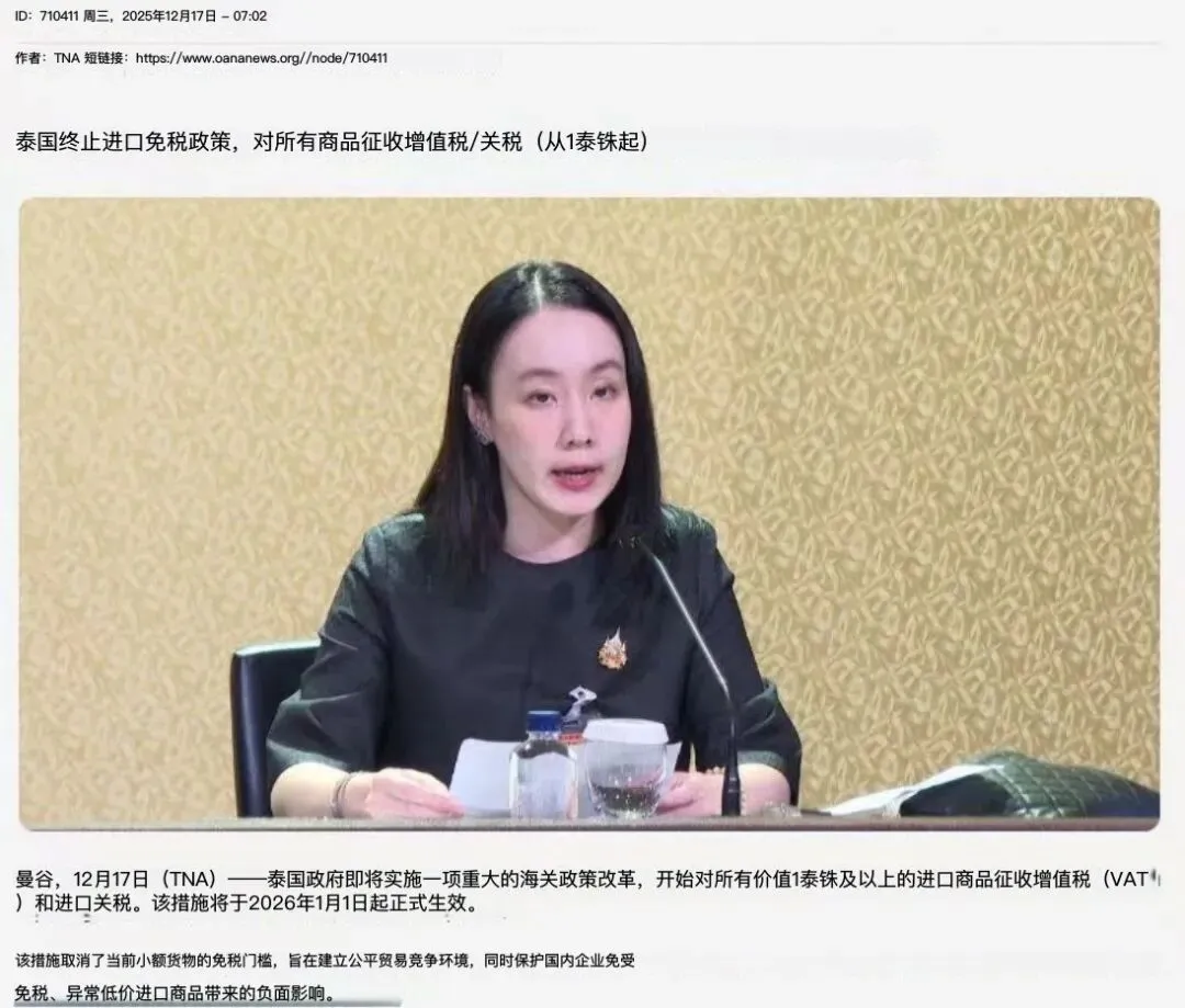 自2026年1月1日起,泰国进口政策将迎来颠覆性调整。原有低值免税制度被彻底废止,几乎所有入境商品均被纳入关税与增值税的双重征收范围,这意味着以低申报、小包直邮为核心的跨境贸易旧模式,正面临系统性清场。与此同时,泰国海关的开箱查验率大幅提升,边境口岸更将实施100%安检,进口监管全面收紧。