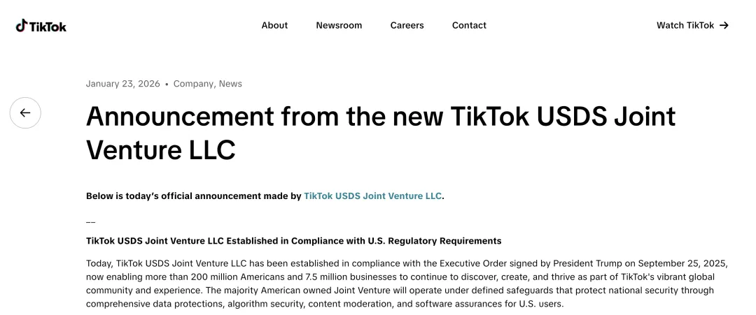 据媒体报道,就在今天,TikTok官网正式宣布,TikTok美国数据安全合资公司(TikTok USDS)正式成立。