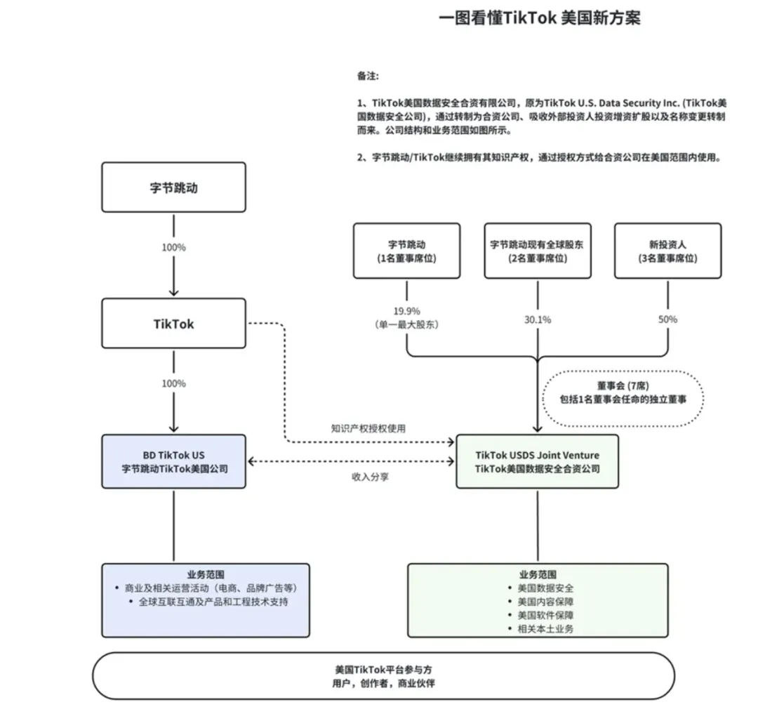 股东方面,吸收了甲骨文、银湖等美国资本增资,字节跳动持股19.9%,刚好卡在美方“外国控制持股不超20%”的红线内,既满足合规要求,又保住单一最大股东的话语权。