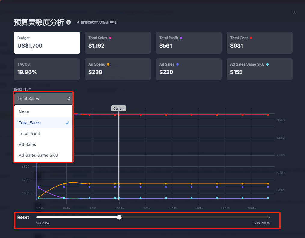 预算模拟功能可基于每个广告组的预算调整,预测未来7天内关键指标的变化趋势。可通过底部的交互式进度条,灵活按比例调整当前预算,并依据目标KPI(如总销售额、利润、广告销售额或同一SKU的广告销售额)进行模拟设定。系统将据此生成最优预算建议,并展示所选指标对应的预估效果,运营人员可以据此制定预算策略、提升广告投放效率。
