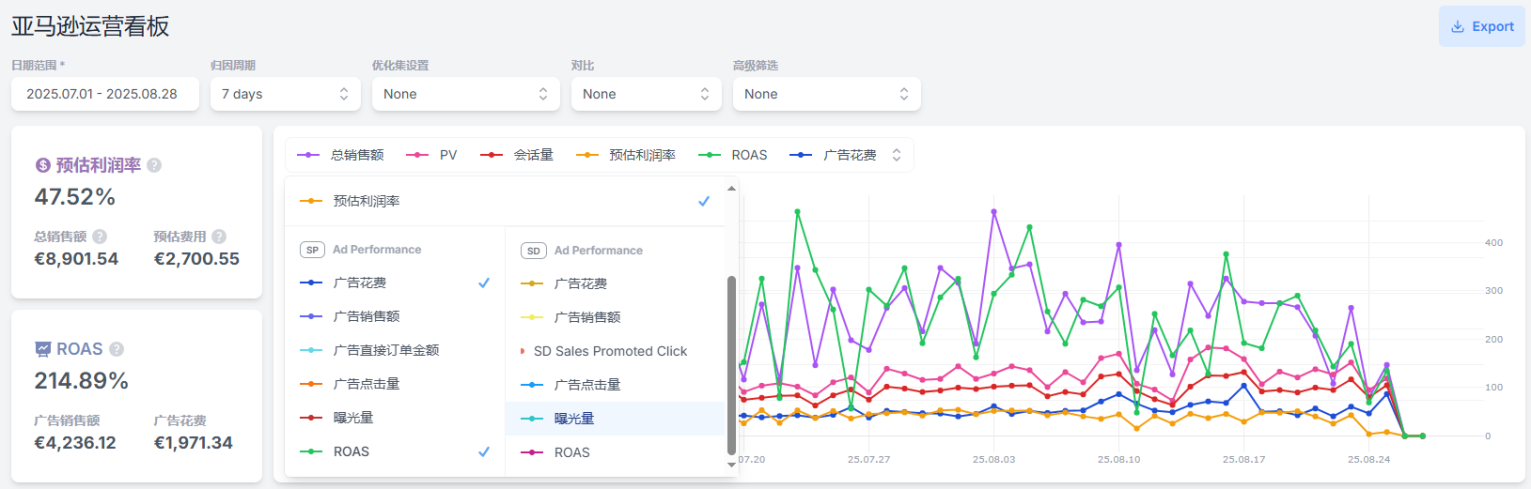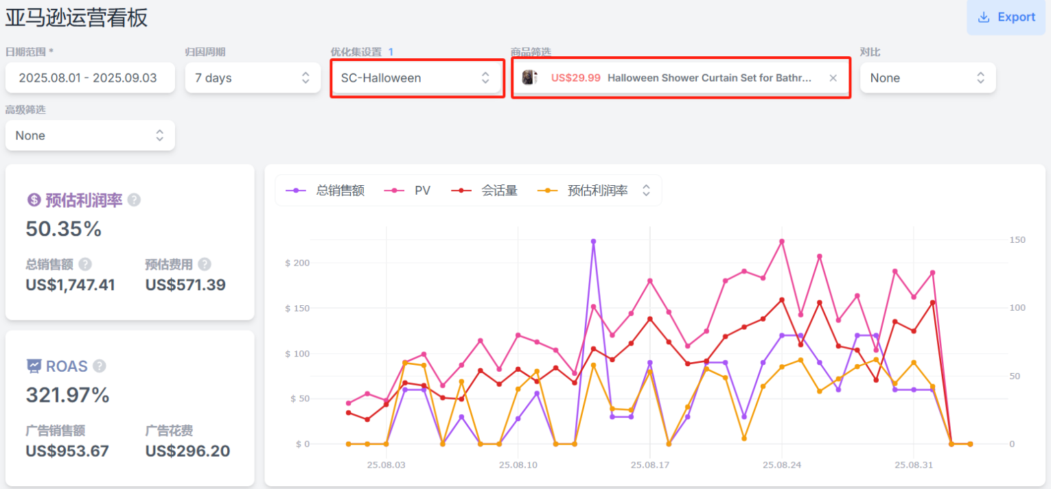 Tips:顶部筛选区支持灵活的自定义配置,卖家可轻松实现从店铺/广告组/ASIN/时间等不同维度的数据对比,同时,系统会自动生成可视化的数据分析报表,帮助卖家快速获得核心洞察,锁定优化方向。