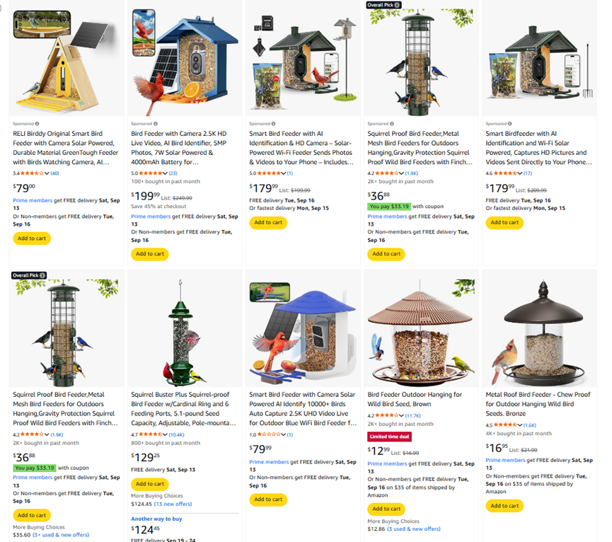 这么大一块市场蛋糕也吸引了不少跨境卖家入场,赛贝在亚马逊美国站点用“Bird feeder”搜索发现有超2w条在售链接,足见卖家们对这一市场的热情。