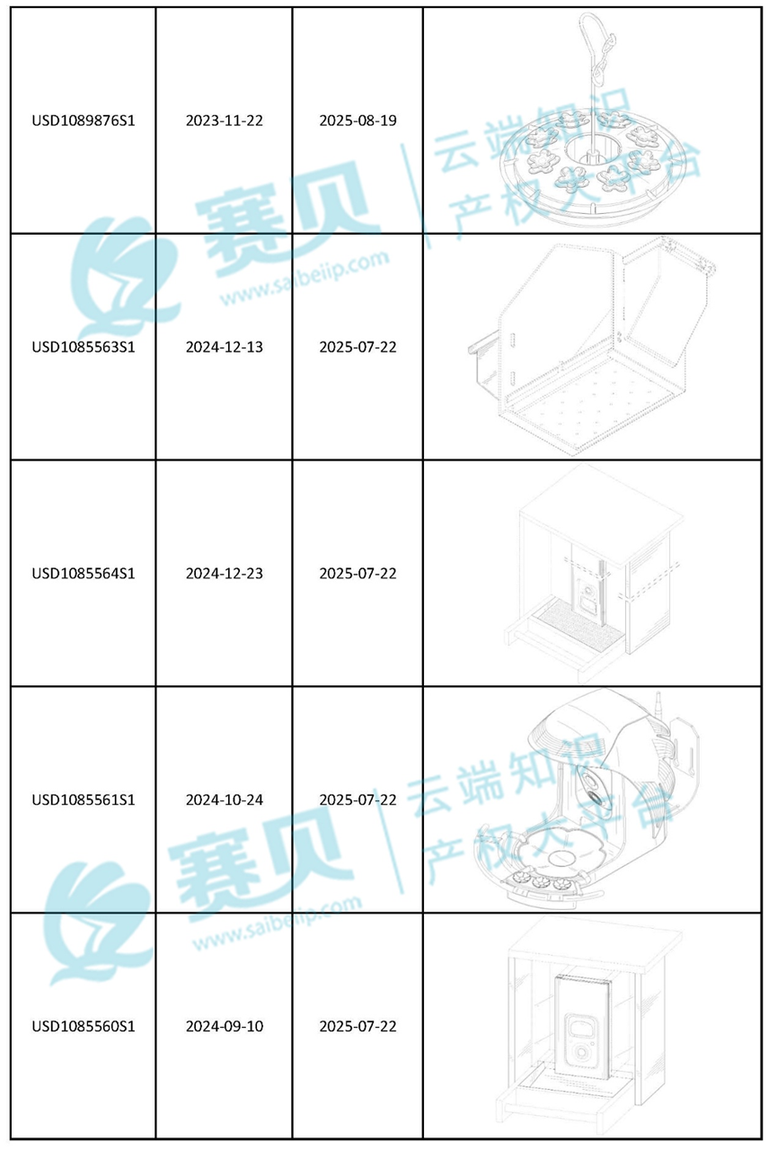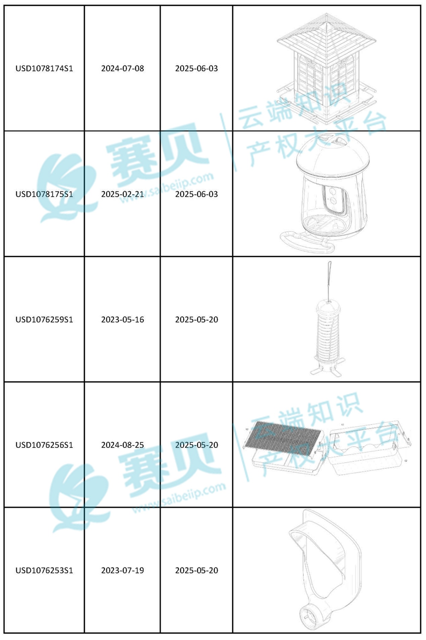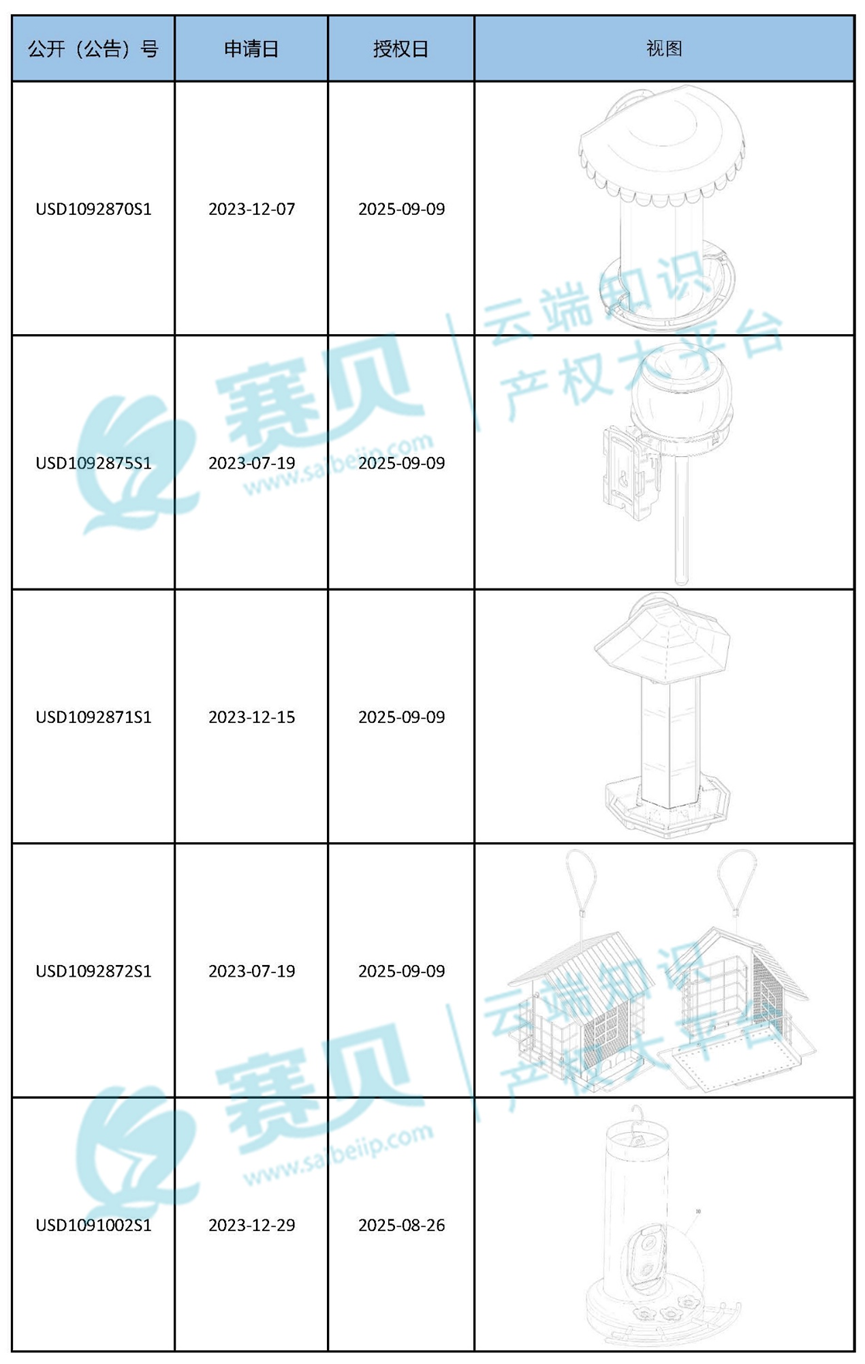赛贝为大家整理了2024年到2025年9月9日最新下证的喂鸟器美国外观专利,希望能帮助咱们跨境卖家有效预警、规避侵权!以下是部分内容: