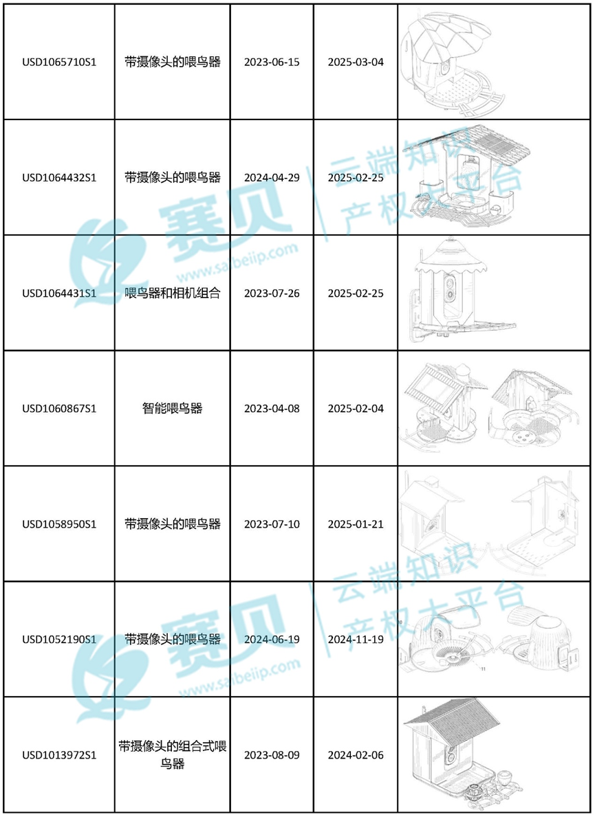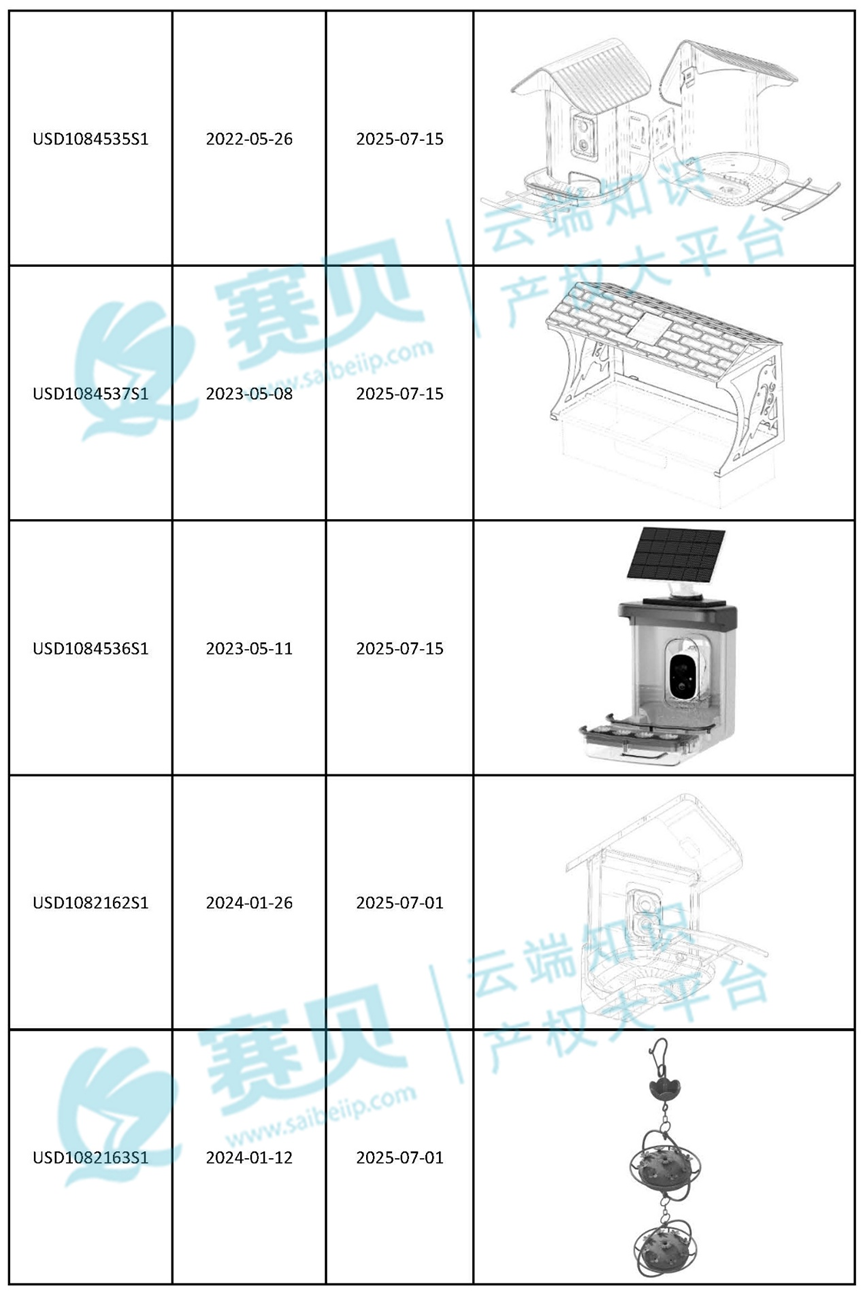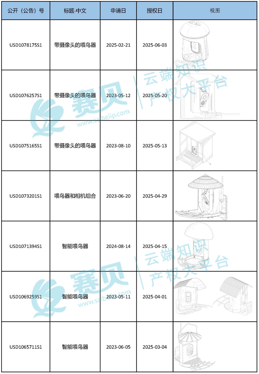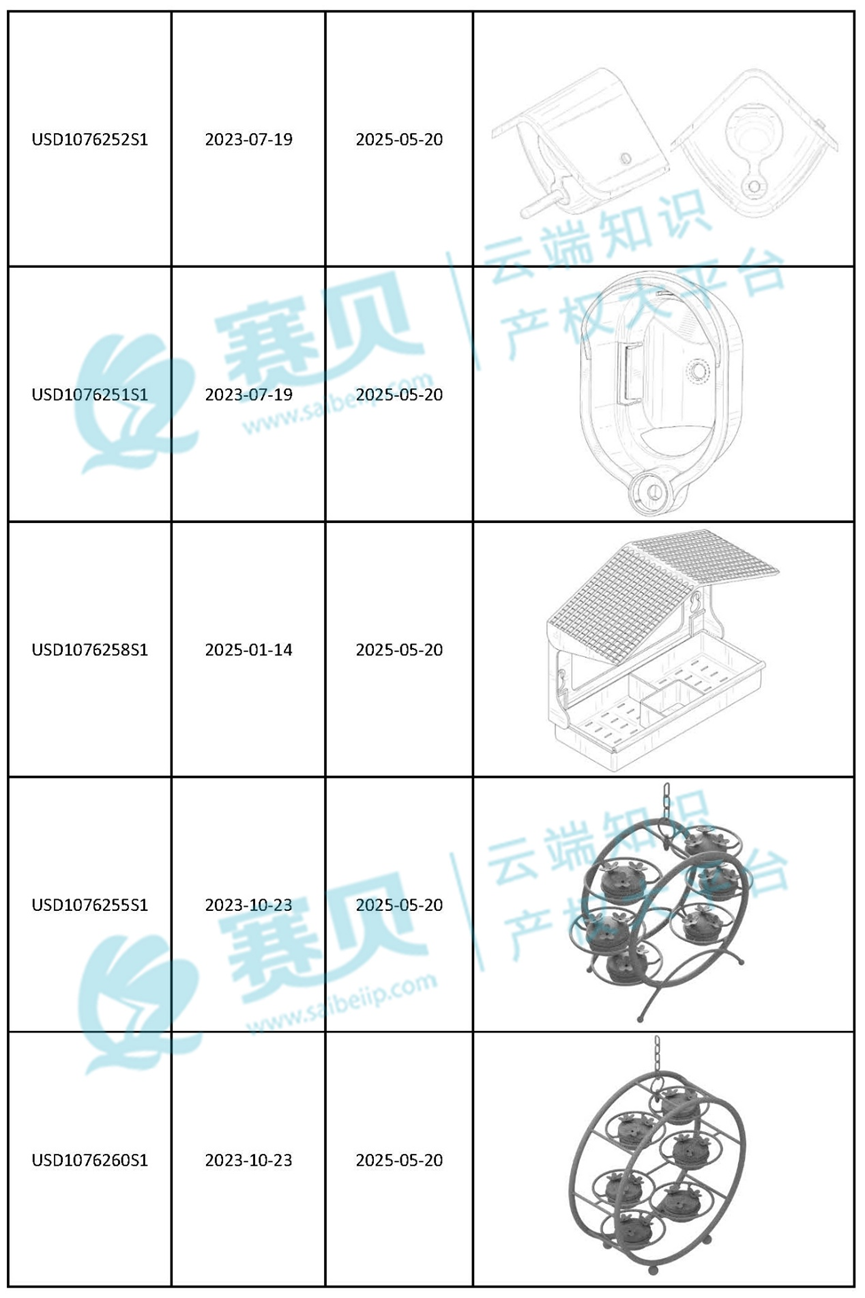 赛贝为大家整理了2024年到2025年9月9日最新下证的喂鸟器美国外观专利,希望能帮助咱们跨境卖家有效预警、规避侵权!以下是部分内容: