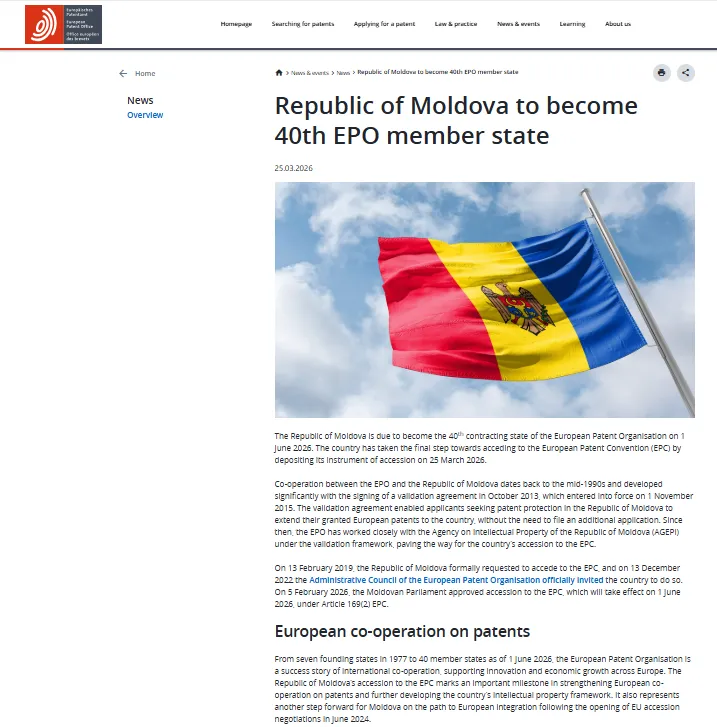 3月26日,欧洲专利组织官方网站发布消息:摩尔多瓦共和国于2026年3月25日提交了加入欧洲专利组织缔约国的文书。将于6月1日起成为欧洲专利组织的第40个成员国。