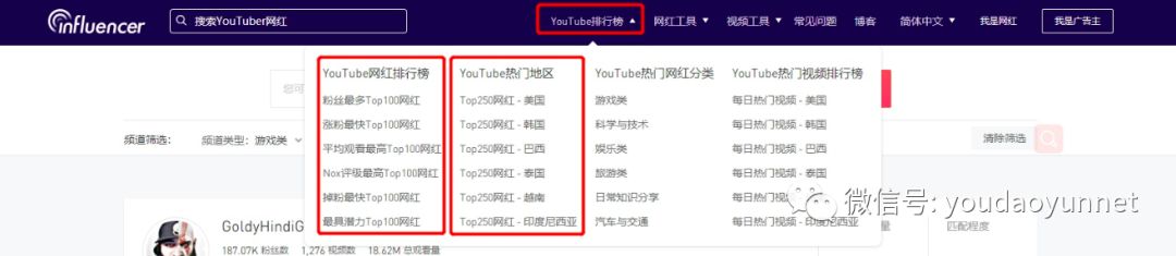 情况二:对于预算、价格以及海外网红了解不多的广告主,您可从官网首页上“YouTube排行榜工具”入口查看全球YouTube网红排名趋势、粉丝增长幅度以及视频被观看情况等等,实时了解涨粉最快、掉粉最快、最具潜力等多维网红榜单的查询结果。还可以寻找海外热门网红分类及热门视频排行榜,了解YouTube受众。待了解和熟知后这些内容后,可根据预期效果及预算针对“情况一”相关进行合作。