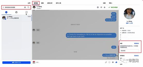 4、善用收件箱标签,有效管理顾客对话。无论是从Messenger、Facebook主页、Instagram上过来的消息,都可以利用收件箱标签进行统一管理和回复。当卖家需要对不同客群进行追踪的时候就可以按照标签去做回复。