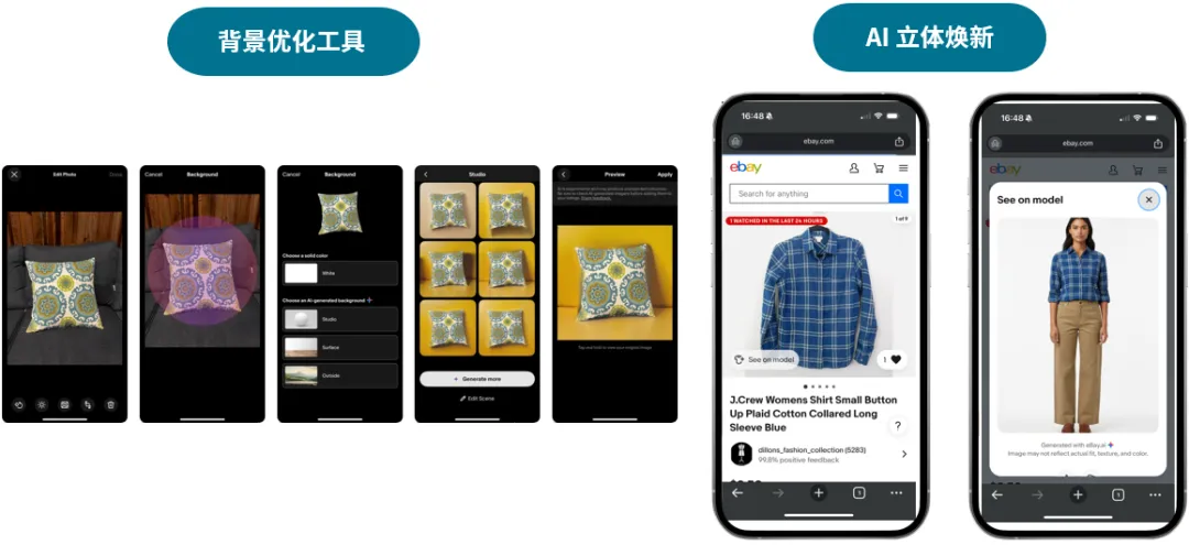 在商品展示方面,eBay提供了AI图像背景优化工具,支持卖家移除原有背景并替换为干净或风格化的展示场景。该功能从自动白底处理逐步扩展至多种背景样式选择,帮助卖家在不依赖专业设备、不增加额外成本的情况下,提升商品图片的一致性和专业度。