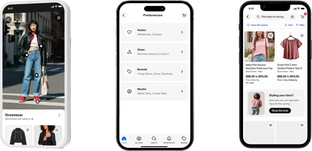 “Shop the Look”功能为用户量身定制时尚灵感,精准契合其独特风格。平台借助生成式AI技术,可根据买家的购物习惯,提供成套商品的浏览参考,并支持直接查看和选购相似商品。