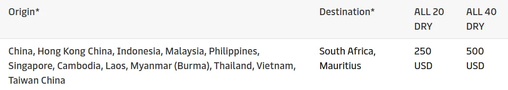 马士基将对从中国、中国香港、印度尼西亚、马来西亚、菲律宾、新加坡、柬埔寨、老挝、缅甸、泰国、中国台湾及越南至南非和毛里求斯的航线,修订旺季附加费(Peak Season Surcharge,简称PSS),适用于所有20英尺干货箱(20 DRY)和所有40英尺干货箱(40 DRY),自2026年4月6日起生效,直至另行通知。