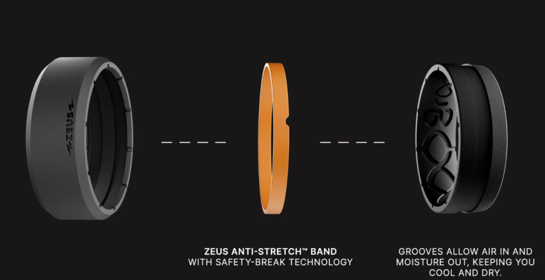 以 Zeus 系列为例,医用级硅胶材质柔韧耐用;独特的空气槽和抗拉结构让戒指久戴舒适,不闷汗、不易断、不致敏;简约的设计既符合健身人群的审美,也能自然融入商务人士的穿搭风格。