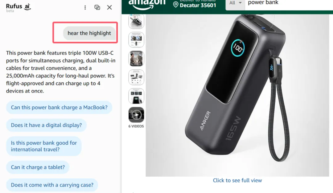 通过在产品页面rufus界面输入:hear the highlight,可以获取rufus对我们产品的卖点抓取信息,对比我们要宣传的卖点是否重叠,如果出现偏差,就需要优化卖点,让rufus精准识别,这样产品的转化率才不会差。